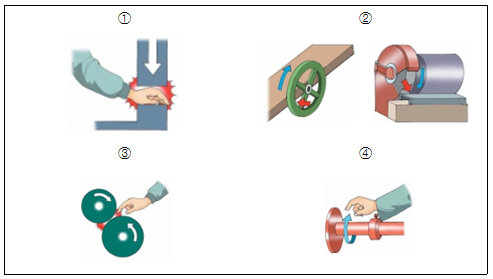 ① 협착점, ② 끼임점, ③ 물림점, ④ 회전말림점